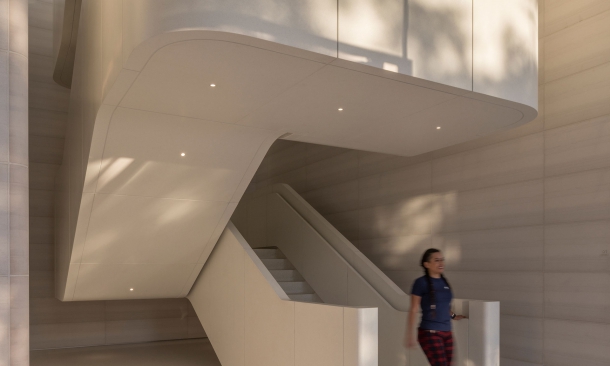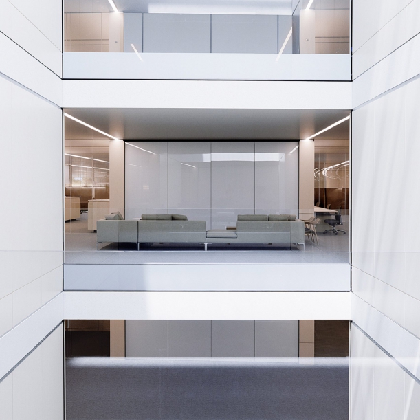 Dalším kontroverzním aspektem stavby je sklo. Centrální budovu tvoří ohýbané skleněné pláty, které mají být největší na světě. Sklo tu má působit jako transparentní prvek tak, aby pohled do okolí nic nerušilo, a zároveň redukovat optickou hmotnost budov. Jenže stavby jsou někdy až příliš neviditelné – dokládají to případy, kdy zaměstnanci do velkých skleněných ploch vrážejí. Několik lidí už muselo vyhledat zdravotnickou pomoc. Na skle se proto údajně začaly objevovat lístečky s varováním, které mají kolizím zabránit. Běžné jsou prý také nálety ptactva, které sklo nevidí.
