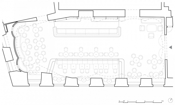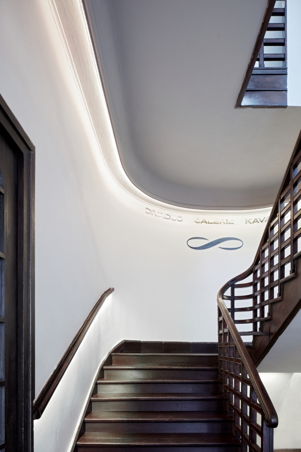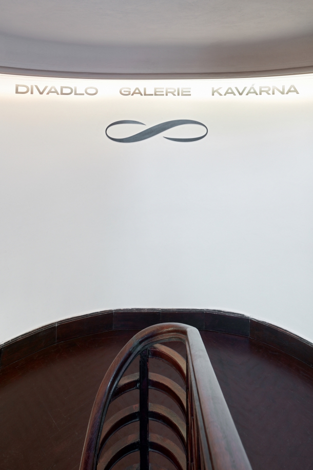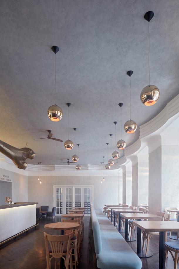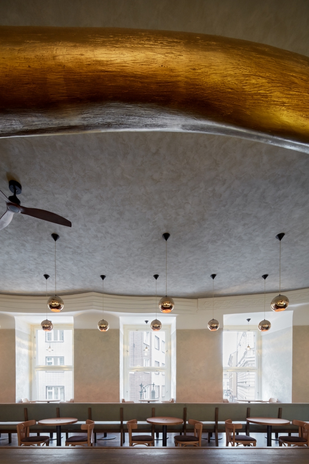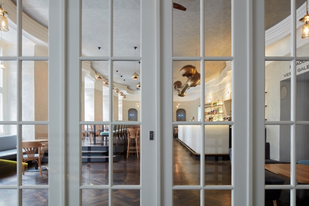Na zdobnou římsu v čele sálu navazují architekti římsou novou, která lemuje celý prostor kavárny. Celkový koncept rekonstrukce na 121 metrech čtverečních přinesl kromě moderního a stylového prostředí také víc míst k sezení i lepší obslužnost baru.