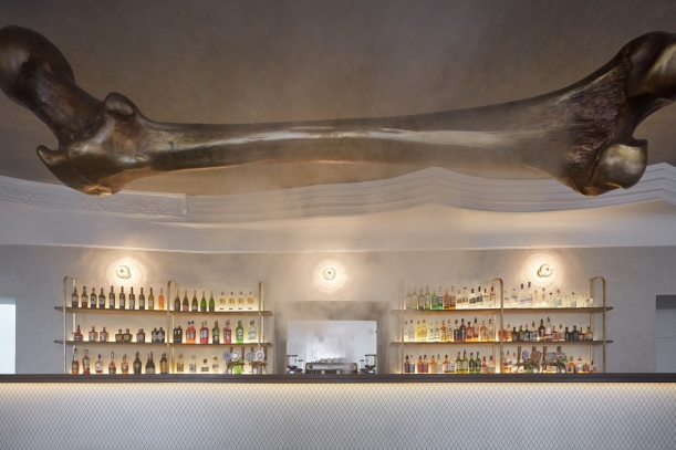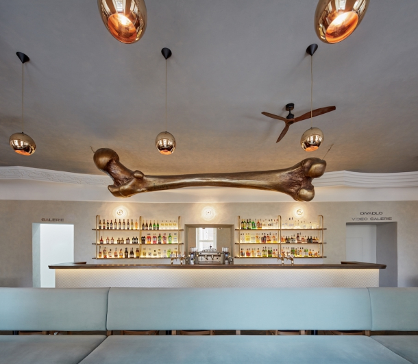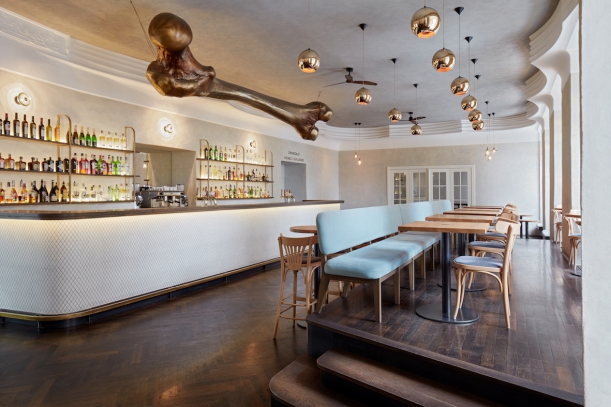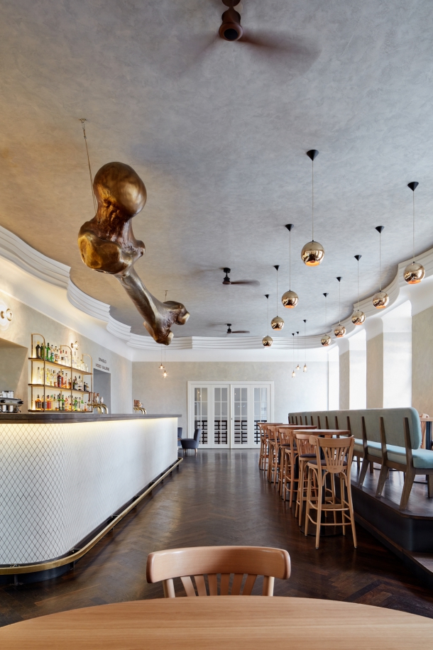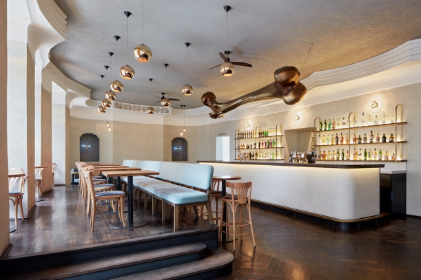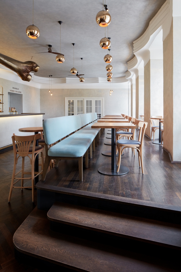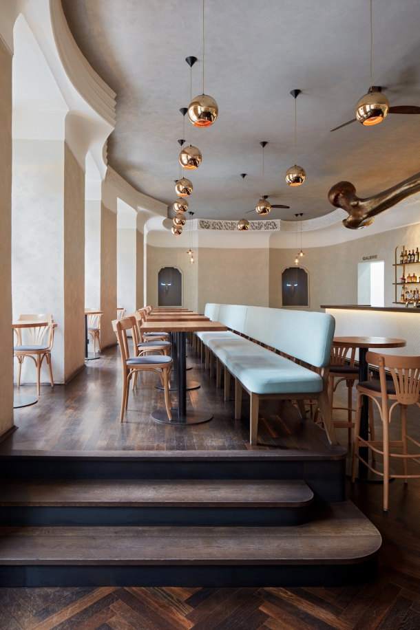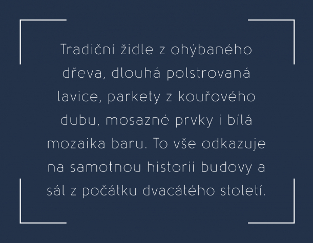 Tradiční židle z ohýbaného dřeva, dlouhá polstrovaná lavice, bílá mozaika baru i mosazné prvky, zřejmé nejen v elegantním osvětlení, odkazují na historii a vznik samotné budovy. Celý prostor pak propojují parkety z kouřového dubu, které skvěle doplňují interiér.