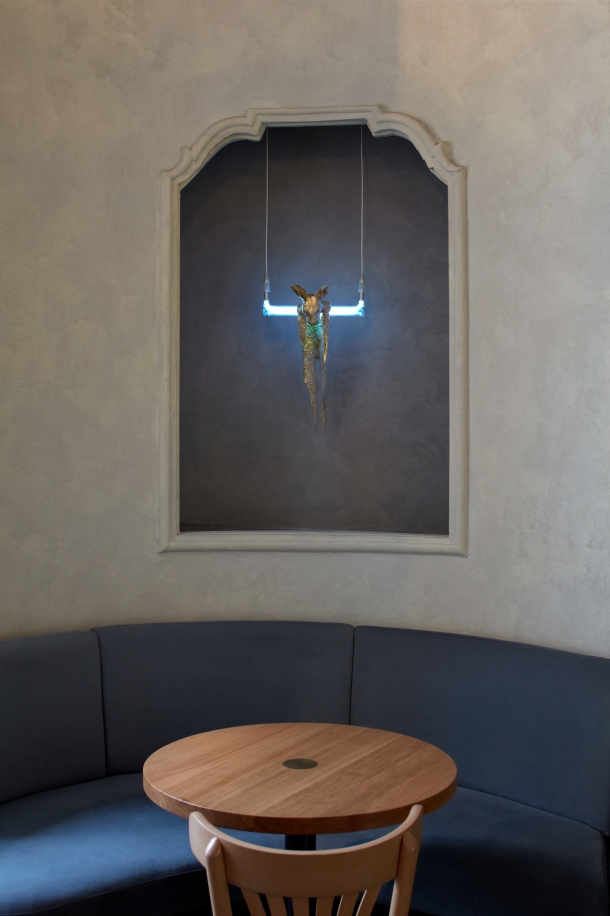 Kromě Zlaté kosti od Jiřího Davida byste v kavárně našli i další díla. V salonku za rohem baru visí například umělecké objekty od Adama Stanka a Heleny Sequens s názvem Utrpení Bugse Bunnyho.