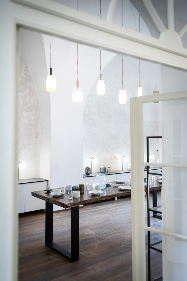 S týmem Artisème se architektky shodly na všem. „Nechtěli jsme takový ten sterilní galerijní prostor s bílou stěrkou na podlaze. Nevynikla by romantičnost domu,” vysvětlují Andrea a Martina. V obchodě tak naopak najdete drobné nedokonalosti, které podtrhují příběh domu a vypadají přirozeně. V kombinaci s křehkými designovými produkty působí prostor něžně a dává vyniknout vysoký klenutým stropům.