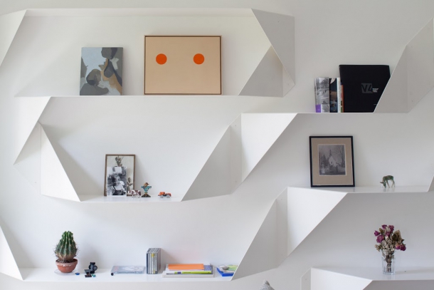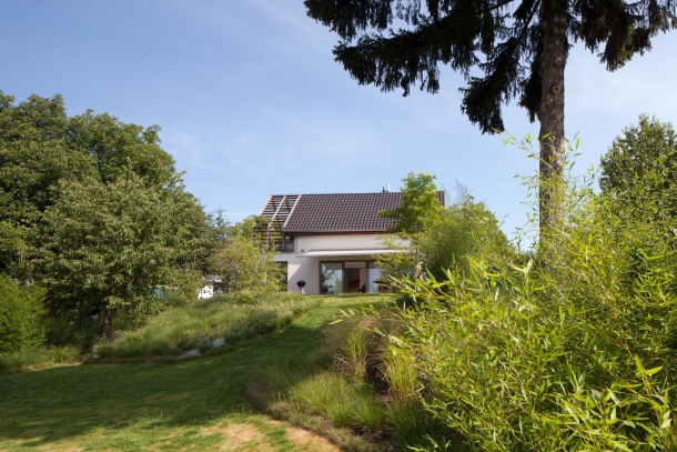 Rekonstrukce a dostavba rodinného domu v Říčanech byla zase velmi netypickým případem, ke kterému měli architekti zpočátku mnoho výhrad - investor totiž zakoupil dům již hotový. Nakonec se ale z projektu vyklubala zajímavá zkušenost a výzva. „Pro projekt jsme vyvinuli vlastní stůl,“ popisuje Jerry Koza, „a k tomu knihovnu, která vznikla z ohýbaného ocelového plechu a je velmi výtvarná.“ Aby architekti objekt opticky vyvážili, přidali navíc novou pergolu.