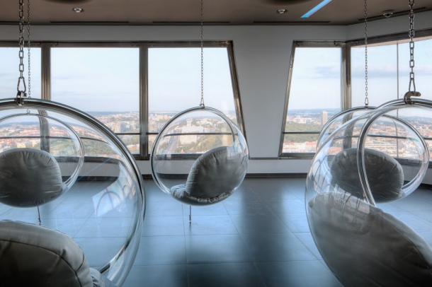 Snad nejznámější realizací Atelieru SAD je interiér Žižkovské věže, ve které vznikl jak luxusní apartmán k pronájmu, tak bar a restaurace Oblaca. Projekt je plný futuristického designu a jedním z výrazných prvků jsou například schody s ilustracemi slavných světových televizních věží. Více se o projektu dočtete v našem samostatném článku.