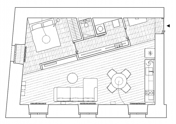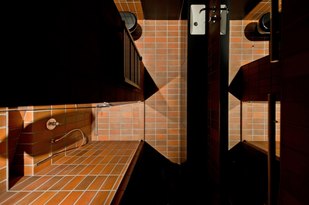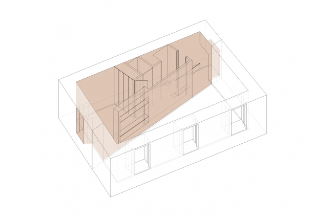Díky diagonálně umístěnému přepažení zůstávají jednotlivé prostory variabilní ve vzájemném propojení i jednoduché proměně v navzájem izolované místnosti. Koupelna tak zůstává v interakci s ostatními zónami rezidenčního bydlení – nezarámované dveře po obou stranách se dají zcela otevřít a v bytě tak rázem vzniká průchozí kruhový prostor. Umyvadlo a úložné skříňky umístěné podél dělící stěny svou délkou a černým dřevěným povrchem nábytku evokují tvary klasické kuchyňské linky. Tmavé povrchy desek jen dotvářejí privátní atmosféru, která je pro tuto část tak typická.