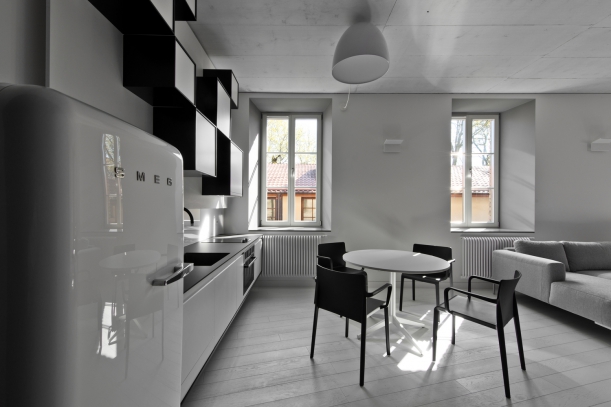 Kuchyňský kout byl vytvořen v duchu minimalismu – geometrické tvary a bíločerné kombinace tvoří jeho jádro, ať už se jedná o úložné krychlové skříňky umístěné nad pracovní plochou v nepravidelných formátech a polohách nebo o bílou retro lednici od ikonických Smeg, kteří již šedesát let udávají trendy na poli domácích spotřebičů.