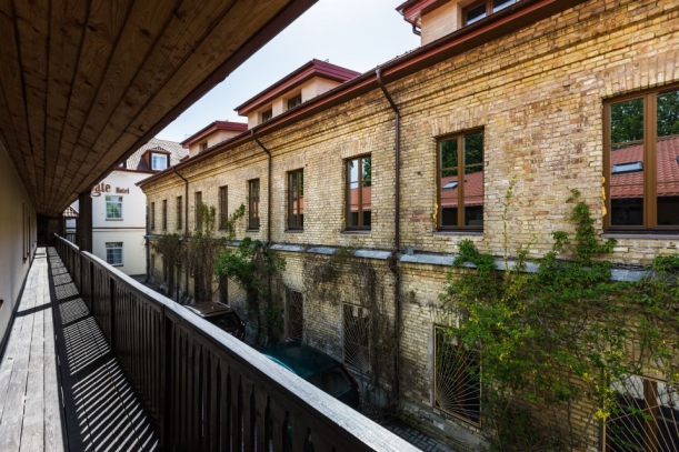 Obývací pokoj tvoří šedá pohovka a černý odkládací stolek orientovaný čelem ke slínkové zdi s vestavěným krbem. Stěna z hliněných dlaždic svou strukturou a materiálem evokuje povrch městských fasád a vytváří tak přirozenou tapetu, která připomene nejedno zákoutí pobaltské metropole. Použití cihel také odkazuje k historické tradici staveb, které se díky nedostatku obvyklého stavebního materiálu – kamene, používaného v minulosti poměrně standardně napříč celou Evropou, uchýlilo k výstavbě z pálených cihel. Vilnius, Riga ale i Trakai si pobaltskou cihlovou gotikou získali široký věhlas již ve 13. století.