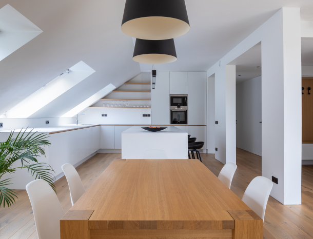 Zbožňujete půdní byty, ale je vám blízký minimalismus? Pak právě pro vás je prohlídka tohoto rekonstruovaného půdního bytu v rezidenční a diplomatické čtvrti Bubenči. Byt se nachází v rezidenčním komplexu hned vedle modernistické vily Bianca, kterou navrhl architekt Jan Kotěra. V 90. letech k ní přibyly další rezidenční budovy nizozemského architekta Ericka van Egeraata. Okolo původní vily navrhl domy, které potichu našlapují a jsou v dialogu s historickou budovou.
