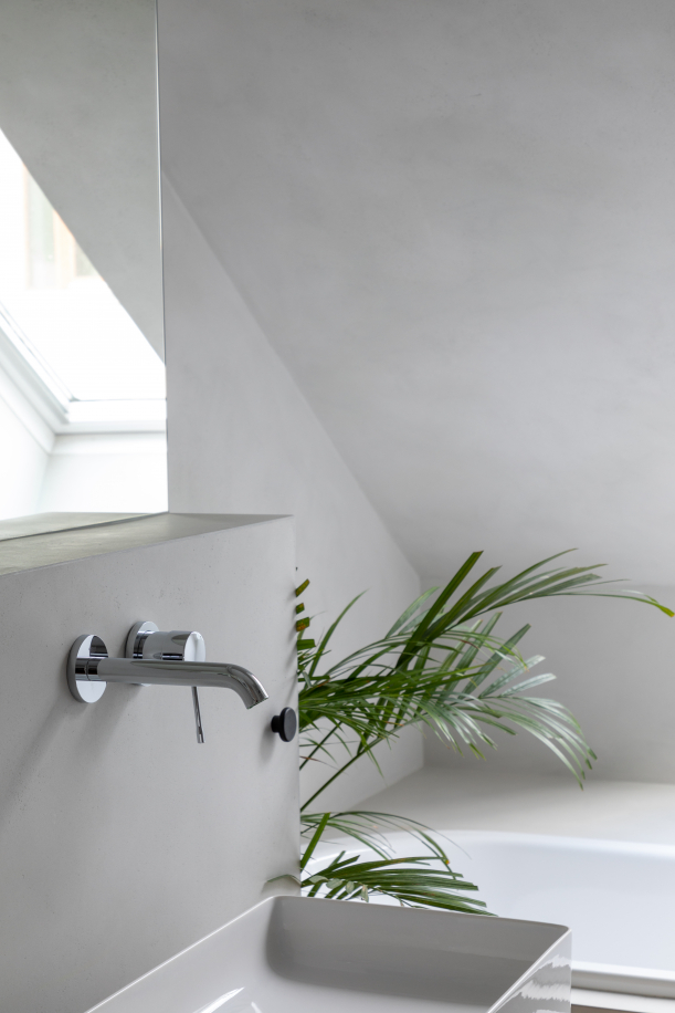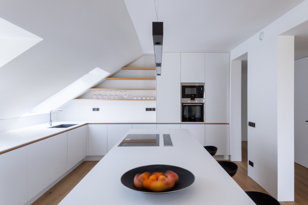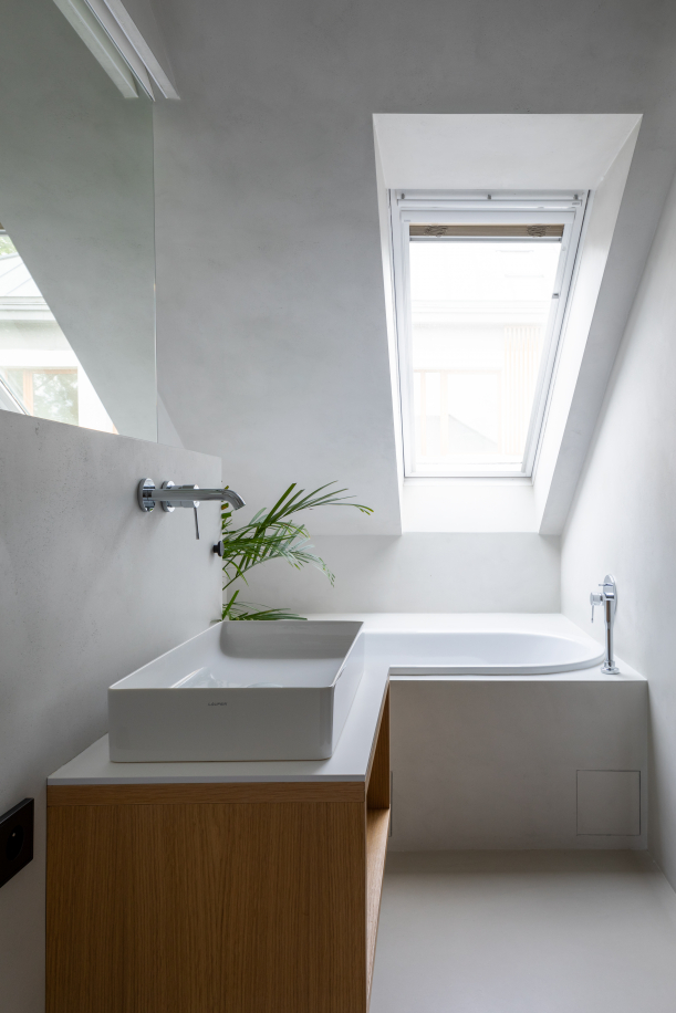 V tomto duchu přistoupili i Komon architekti k rekonstrukci půdního bytu jedné z budov. Referenčním rámcem jim už ale nebyla modernistická vila, ale mladý pár, který zde bude bydlet. „Naším cílem bylo vytvořit klidný a kultivovaný prostor sjednocený promyšlenými detaily a redukovanou paletou přírodních materiálů. Skutečným domovem, podle obrazu majitele, se stane užíváním a postupným zabydlením prostoru,“ říká architekt projektu Martin Gaberle.