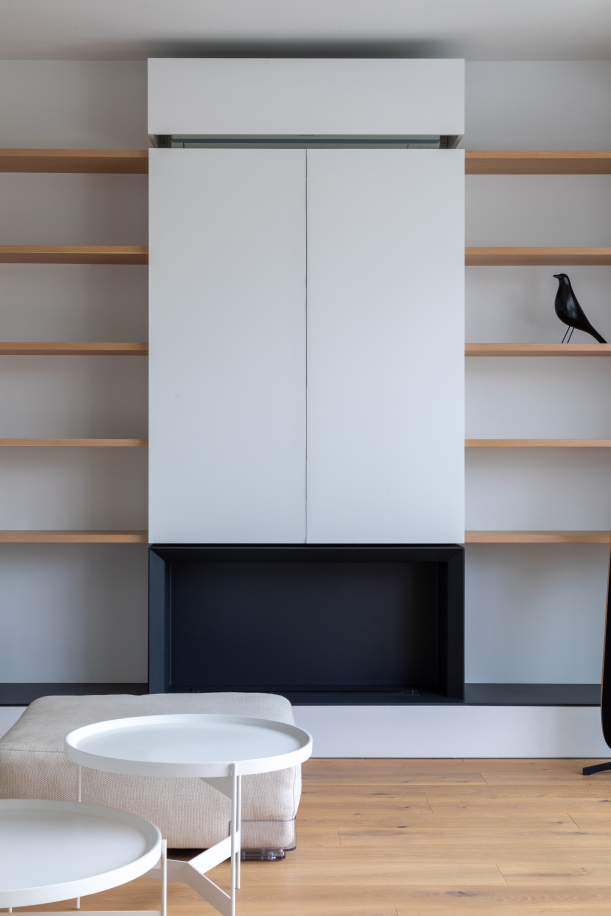 Většina nýbytku byla vytvořena na míru. Nábytek nad krbem skrývá bar a klimatizaci, mezi závěsy před francouzským oknem je zabudované projekční plátno.