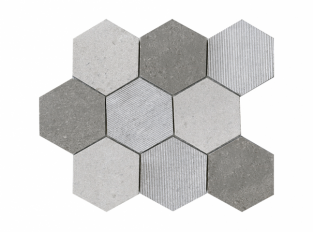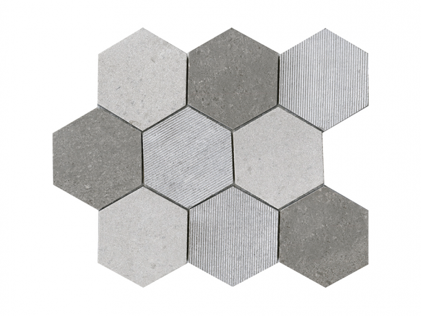 Španělský koncern Porcelanosa je králem obkladů všeho druhu. Kolekce Mosaico hýří barvami a různými typy materiálů. Vzor World Hexagon Texture Grey připomíná medové plástve – v kamenné podobě. Mozaiky dodává společnost Design Bath.