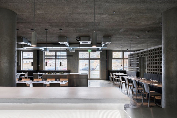 Celý prostor má několik částí, každá má jiný účel. V restauraci zůstaly odhalené železobetonové konstrukční prvky, které doplňuje obložení zdí ze surového heraklitu. Díky pečlivě vybranému mobiliáři působí restaurační část střídmě, ale zároveň útulně. Tento pocit podtrhuje především čalouněná lavice, která lemuje celý prostor restaurace. Velkou roli zde hraje také osvětlení. V částech určených pro hosty zajišťují světlo decentní betonová svítidla zavěšená přímo nad jednotlivými stoly. Vytváří intimní a teplou atmosféru. Funkční prostory zase osvětluje silné studené světlo, které podtrhuje jejich hygienicko-technický charakter.