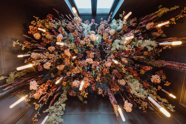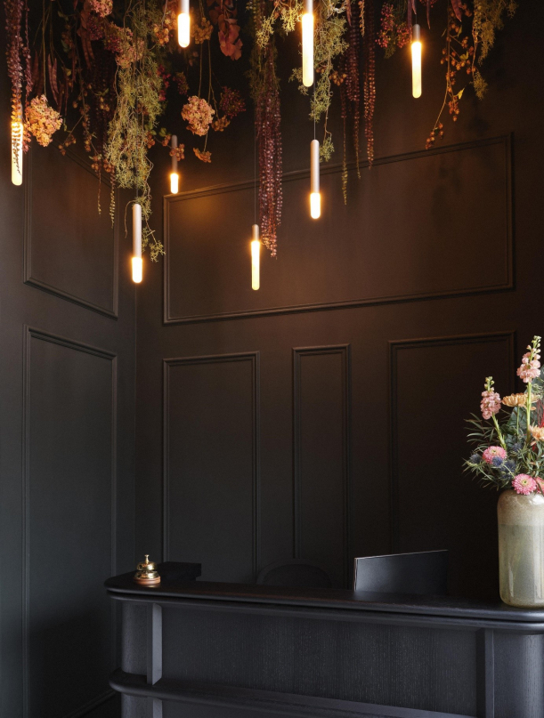 Vstup do hlavní budovy okamžitě předurčuje, v jakém duchu se nese celý interiér hotelu. Nad hlavami hostů ze stropu sestupuje sezónní květinová dekorace. Svítidlo společně s rostlinami navozuje pocit, jako by sluneční paprsky právě protkaly zeleň.