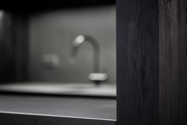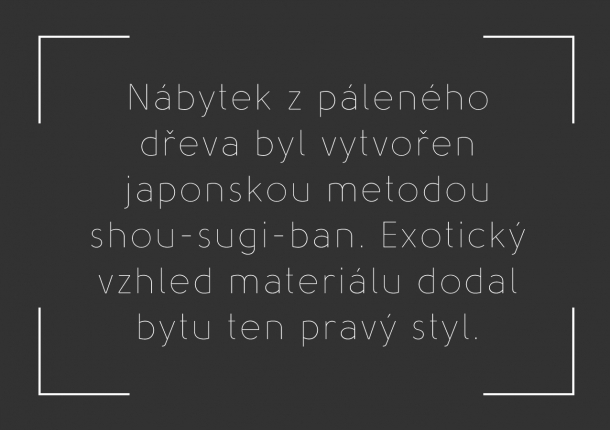 A proč architekt zvolil právě tmavý dřevěný nábytek? „Inspirací mi je vždy příroda. V ateliéru jsem testoval povrchy z páleného dřeva, japonskou metodu shou-sugi-ban. Tu jsem poprvé viděl v Paříži při návštěvě Galerie Lafayette v luxusním butiku. Rozhodl jsem se přesvědčit klienta, že tento materiál je svým exotickým vzhledem tím pravým pro tento byt,“ vysvětluje svůj záměr architekt.