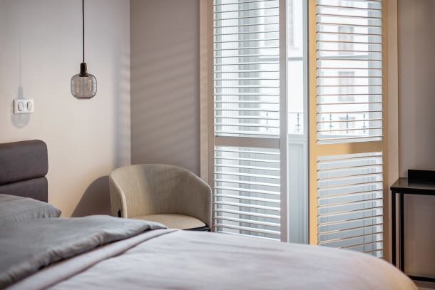 Ložnice, tak jako i ostatní prostory v bytě, jsou laděné do různých tónů šedi. Vše doplňuje tmavý nábytek a dřevěná podlaha, dodávající pocit tepla. Světlé okenice jsou příjemným zpestřením i ozdobou, která navozuje vůni dálek.