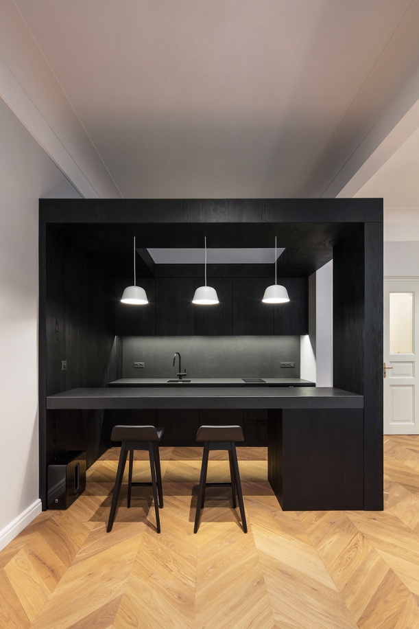 Dům prošel celkovou rekonstrukcí a do původní podoby bytu se nemuselo moc zasahovat. Úpravy dispozice proběhly v rámci klientových požadavků; jeho přáním bylo propojit dvě samostatné místnosti, kuchyň a obývací pokoj v jeden prostor. Tím vznikl velkorysý objem, ve kterém si dále architekt mohl pohrát s vložením kuchyňského boxu a dalších interiérových doplňků.