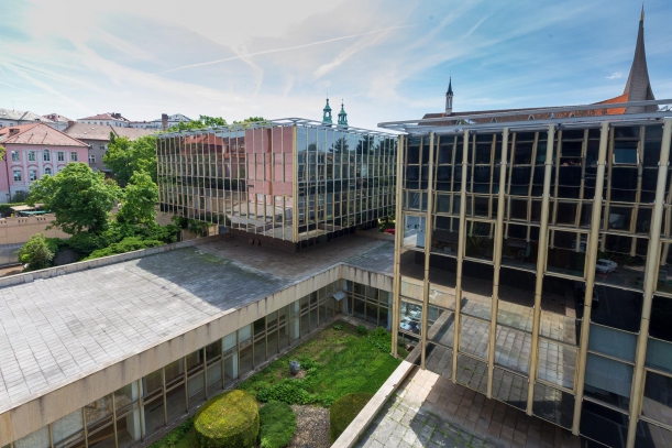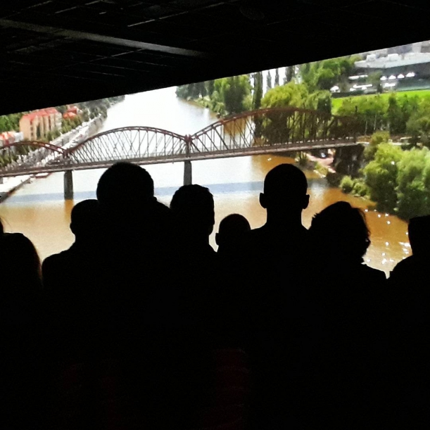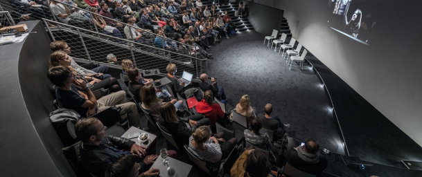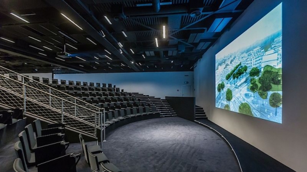 V CAMPu najdete i promítací sál řešený jako amfiteátr s více než stovkou míst, který hostí vedle promítání i diskuze nebo konference. Tmavé stěny i strop nechávají vyniknout hlavnímu prvku – rozměrnému širokoúhlému plátnu.