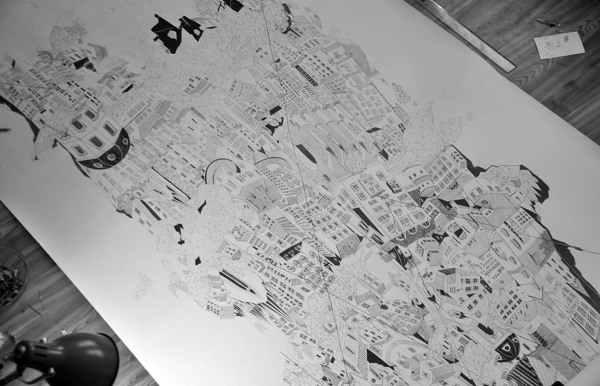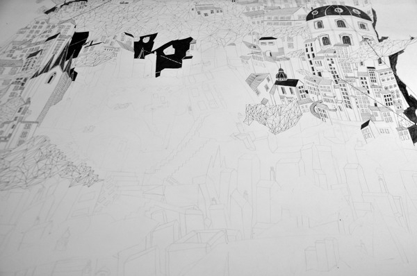 „V plánu jsme měli pracovat na samotné kresbě měsíc, což byla taková romantická představa,“ říká ateliér. Realizaci předcházely dva měsíce navrhování a řešení technických podmínek. „Kresba nám pak zabrala další dva měsíce,“ dodávají umělci.