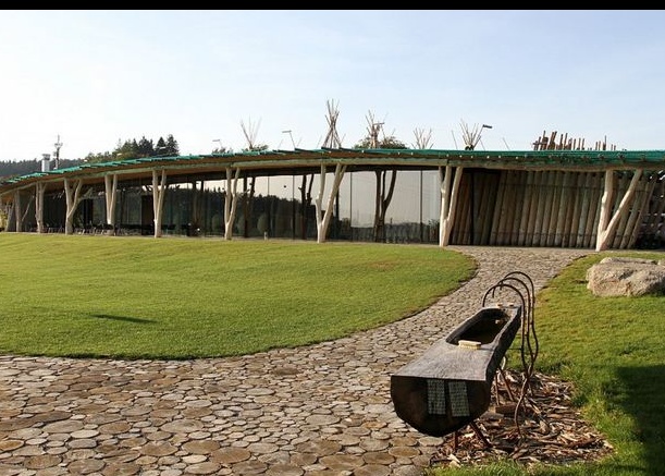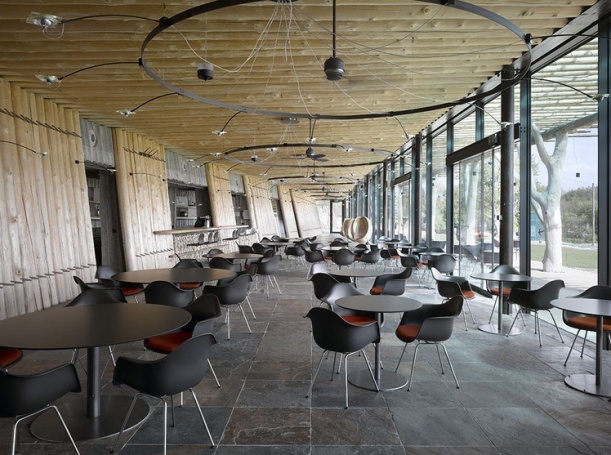 Středobodem celého areálu je klubovna se zázemím a restaurací volně přístupnou veřejnosti.Vnitřní prostory pomalu přechází v terasu, která je zastřěšená tenkými smrkovými kmeny. Také díky bohatému použití přírodních materiálů - od akátové či břidlicové podlahy po dřevěnou fasádu - objekt příjemně navazuje na okolní krajinu.