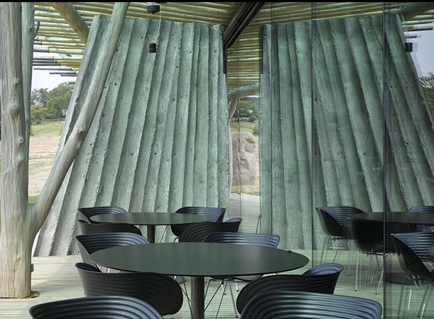 Dřevo se v prosotoru snoubí s betonovými prvky. Cílem Stanislava Fialy prý bylo kombinovat umělý kámen a archaickým dřevem tak, aby oba prvky byly v zájemném dialogu. „Proto jsme pro bednění některých stropů a stěn použili krajinková prkna, takže se tu navždy otiskly různé suky, chodbičky lýkovce a typické nerovnosti dřeva, jež se ve své opravdové přírodní kráse opírá jen o malý kousek dál o takto formovaný beton," popisuje.