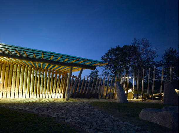 Dominantním prvkem v interiéru je tradiční povalový strop opřený o nakloněnou palisádovou stěnu; podle slov autora tak vzniká pocit bezpečného útočiště. „Povalové stropy patřily v dávné minulosti, kdy mělo lidstvo ještě mnohem blíž k přírodě, k tomu nejobyčejnějšímu, co bylo možné ve staré architektuře spatřit," říká Fiala. Inverzně jsou povaly propsané i do pohledového betonu na bočních stěnách, působivou atmosféru dokresluje výrazná podlaha z hrubé břidlice.