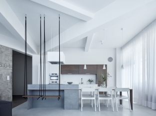 Architekti pracovali s odstíny šedé, černou a bílou. Nejvýraznějším materiálem je beton, který ateliér kombinoval s přírodním dubovým dřevem. Industrialitu do prostoru dostávají i obnažené stropy, ocelové a kovové prvky. Lehkost a světlo do interiéru přinášejí bílé doplňky, třeba prostorná bílá skříň v kuchyni.