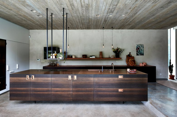 Ostatní místnosti jsou z jedné strany otevřené a propojené dlouhou chodbou. Ložnice se nachází v jakémsi výklenku, obloženém tmavým dřevem. To přechází i do vedlejší části, kde byste našli koupelnu, okouzlující oázu klidu a relaxu.