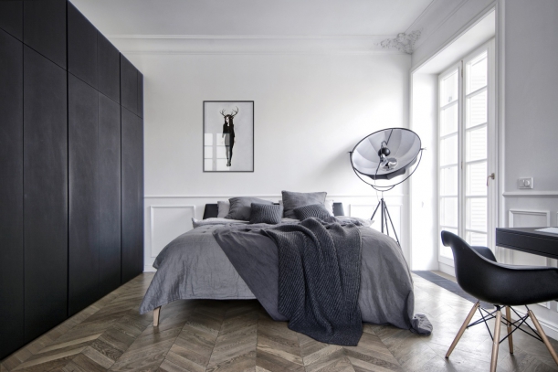 Ložnici byste našli v nejzazším koutě bytu. Hned u postele, nad níž visí obraz v podobném stylu jako v kuchyni, je v černém boxu vestavěná skříň a z druhé strany vchod na balkón. Nachází se zde i menší pracovní prostor, který stylově doplňuje okolní interiér.