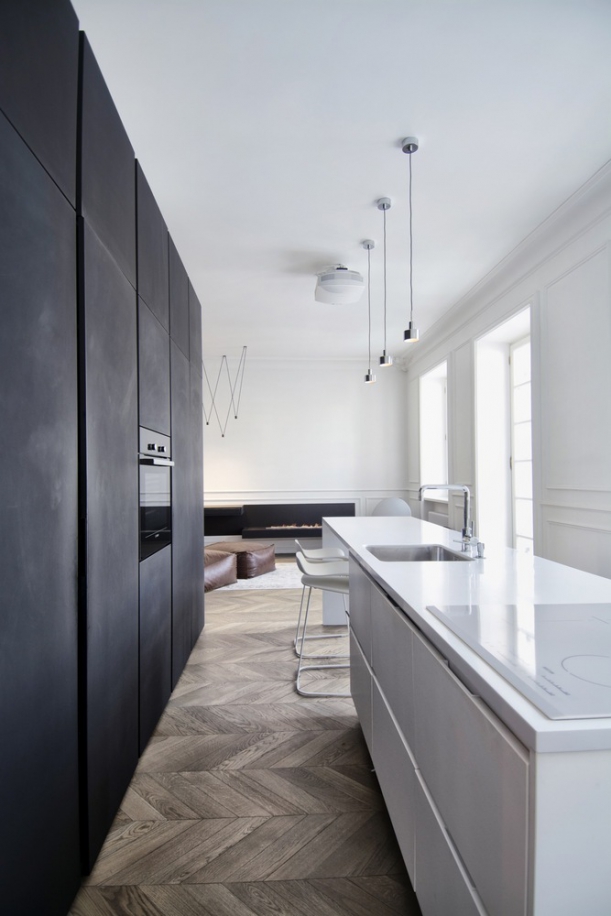 Apartmán se nachází v předrevoluční budově v centru Moskvy. „Skořápku“ bytu architekti navrhli jako odkaz na francouzský neoklasicismus. Celý byt je takřka otevřený prostor, který je pouze dispozičně rozdělen na jednotlivé funkční zóny. Jedinou oddělenou místností je koupelna se sociálním zařízením, která je chytře schovaná za panely s úložným a vestavěným prostorem v centrální části bytu. Jde o jakýsi černý box, který architekti „navlékli“ na toto oddělené jádro.
