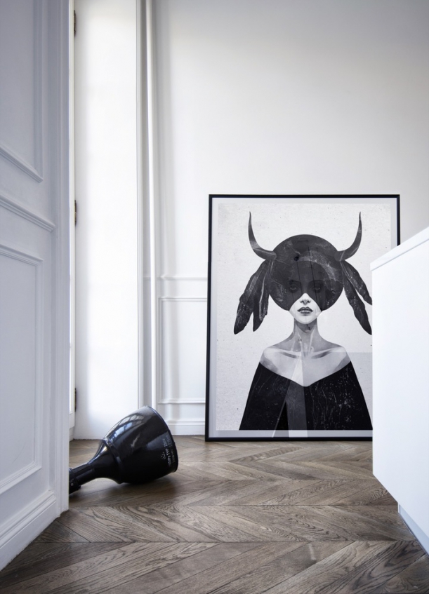 Bílé stěny zdůrazňují proporce bytu a čistotu architektury. Kontrast zajišťuje dominantní centrální box v černé barvě, ale i jiné bytové doplňky. Někde to je závěsné osvětlení, jinde pracovní stůl či židle a v kuchyni zase ohromný obraz s tajuplnou ženou.
