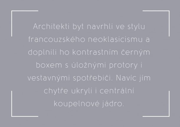 Už při vstupu do apartmánu vás upoutá krásná podlaha z dřevěných parket, která propojuje celý byt. Parkety i další prvky jako jsou bílé stěny, vysoké stropy, velká podlouhlá okna, sádrové římsy či boiserie odkazují na již zmíněný neoklasicismus.