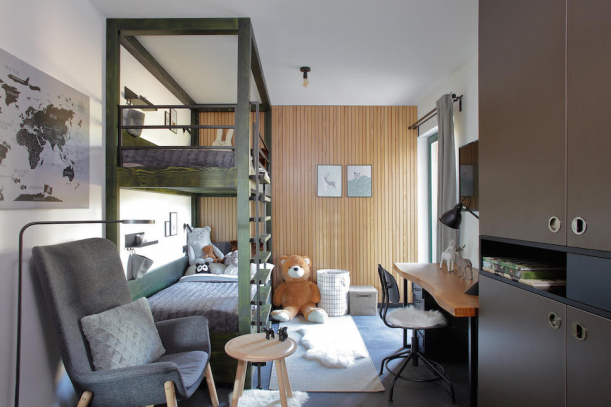 Dominantou dětského pokoje je patrová postel ze smrkového dřeva mořeného do zmiňovaného zeleného odstínu. Na míru dělaná palanda ukazuje poctivou truhlářskou práci, které je v celém bytě více než dost. Navíc chytře šetří prostor a děti tento typ lůžek milují.