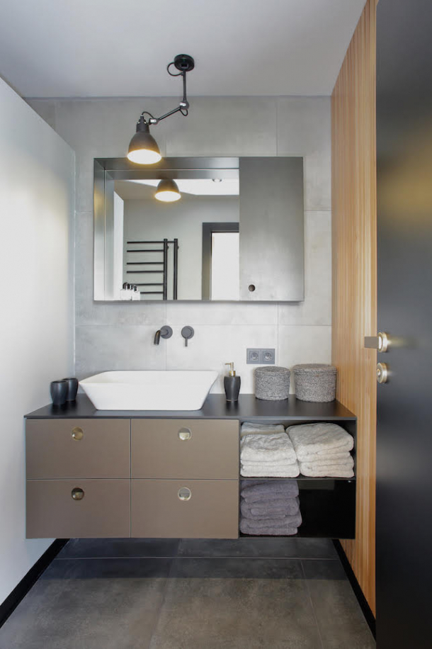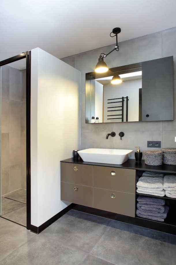 Koupelna se sprchovým koutem je vybavena jednoduchým kovovým nábytkem, který designem navazuje na zbytek úložných prostor v celém bytě včetně kování. Když se zaměříte na svítidla, uvidíte, že stejná použila Martin i v obývacím pokoji a kuchyni.