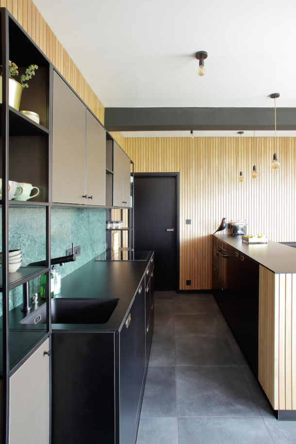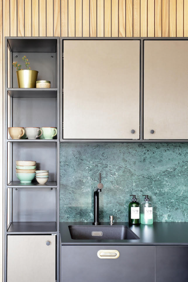 Kuchyňská linka je vedle výhledu z terasy klenotem celé místnosti – zdobí ji zelený mramor Guatemala, který vyniká v kombinaci s jednoduchou kovovou konstrukcí a tmavým základem v zemitých barvách. S tmavší linkou efektně kontrastuje světlé dřevěné obložení.