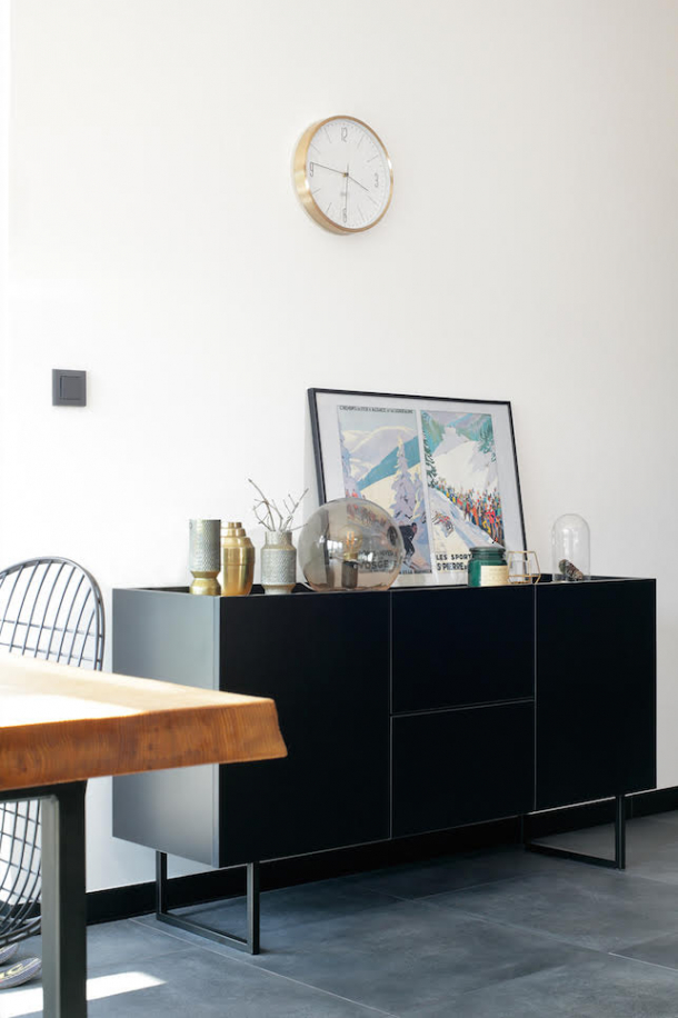 V celém bytě najdete ručně dělané obložení ze světlého dřeva. Bronzové kování a zámečnické práce rovněž vznikaly na zakázku. Spolu s šedou dlažbou tvoří základní elementy interiéru. Přidejte černý kov a máte kompletní paletu materiálů a barev horského apartmánu.