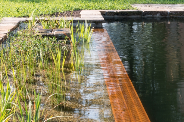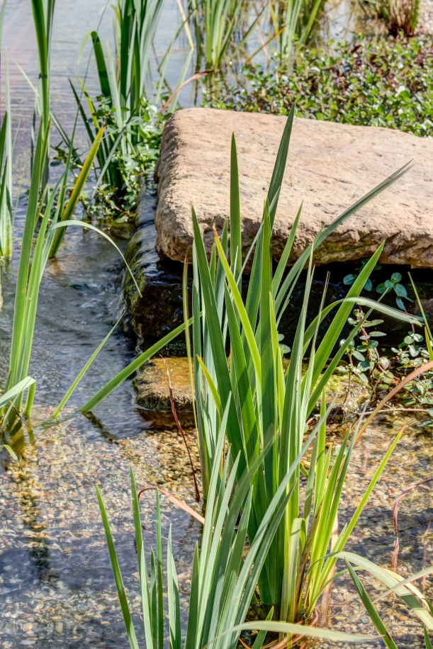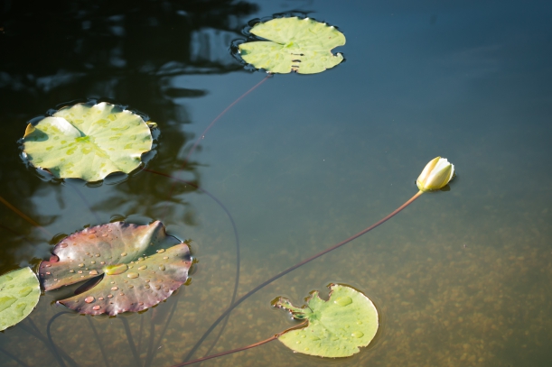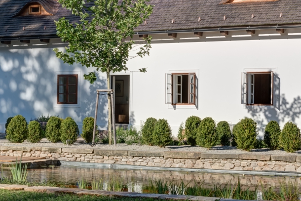Hladina s lekníny, vodními kosatci a mátou odráží stavení, stodoly i stromy kolem, a je tak jedním z nejvýraznějších prvků zahrady a zároveň jakýmsi symbolem celého stavení.