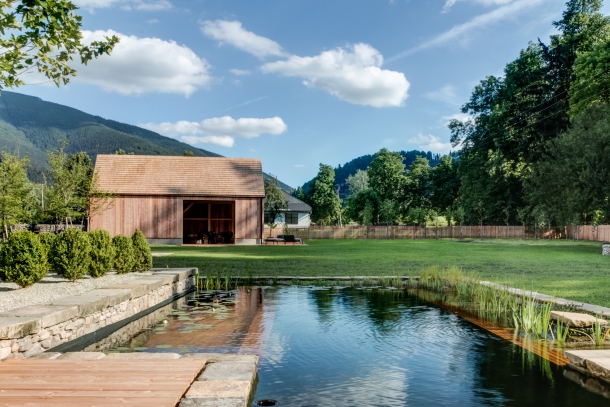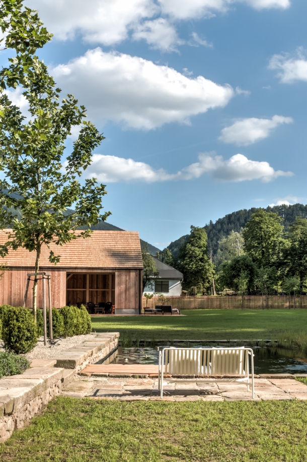 Hotel obklopuje rozlehlá zahrada, která nabízí hned několik zákoutí k relaxaci. Hosté tak můžou využít kamennou terasu k posezení, relaxovat u krbu ve staré stodole přeměněné na zimní zahradu, nebo pobývat v druhé stodole, kde je letní ložnice. Nasávat energii ze slunce na dřevěných terasách v trávě, nebo se vykoupat v přírodním bio jezírku, které rámují staré pískovcové bloky a sahá až do dvoumetrové hloubky.