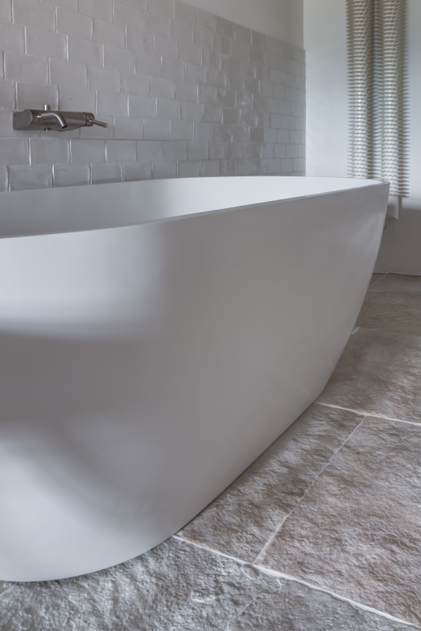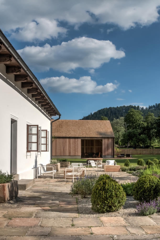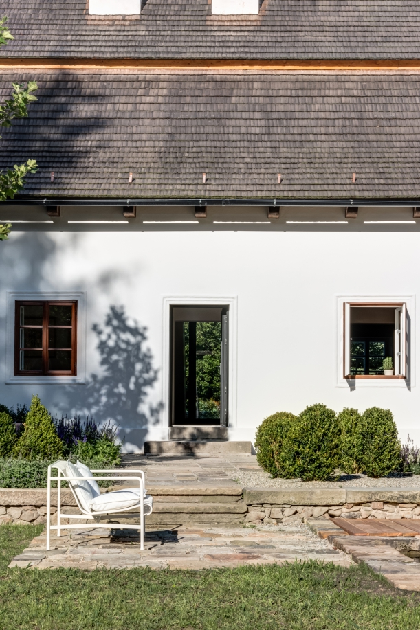 Hlavní vchod do domu vede přes zahradu. „Záměrně vedu hosty do domu původně zadním vchodem, aby o ono přírodní a kouzelné přivítání nepřišli," říká majitelka. Kamenné pískovcové terasy, krásné průhledy i rostliny zde poukazují na místní kořeny a tradice. Téma pokračování a plynutí, soulad i kontrast; právě to hosté ucítí, jakmile vejdou dovnitř. „Kámen, který byl venku, je v předsíni, kuchyni i v celém přízemí domu. Prochází stavením i zahradou," vysvětluje majitelka.