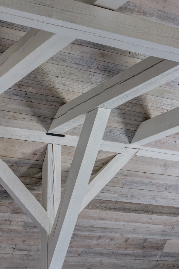 Výběr materiálů na zahradě i uvnitř domu je inspirován okolím. Designérka chtěla zachovat co nejvíce původních architektonických prvků, a proto pro mnohé materiály musela vycestovat trochu dál do Čech, kde se ještě starý stavební materiál tohoto druhu schraňuje a prodává. Renovovány byly trámové stropy: narušené části se nahradily starým dřevem. Na obklady v podkroví byly použity desky ze starých valašských chalup a obklady stodol se pyšní místním modřínem bez povrchových úprav a viditelných spojů, tak jak to kdysi řemeslníci uměli.