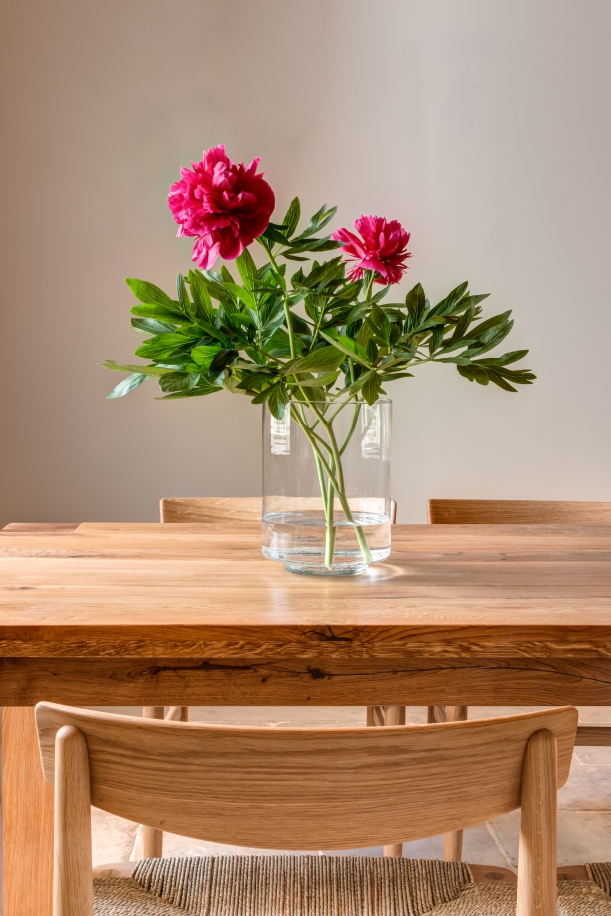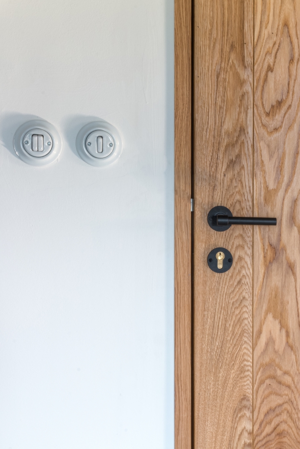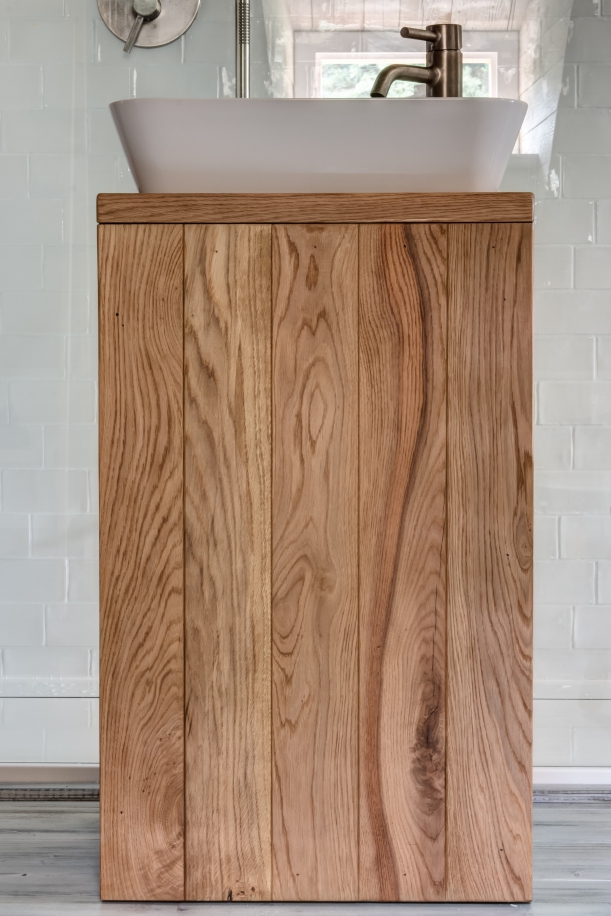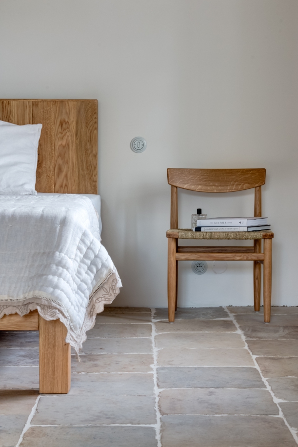 Nábytek navrhla designérka speciálně pro tento projekt a vyrobili ho místní truhláři. Série olejovaného dubového nábytku zahrnuje dveře, stoly a lavice, pulty do koupelen i postele.