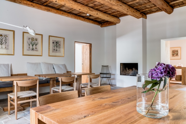 S kuchyní sousedí obývací pokoj a jídelna. Místa pro snídani či večeři, pro čtení i dlouhé večerní povídání. V hotelu nenajdete televizi, ale místo toho je k dispozici hudba a zajímavé knihy o designu a architektuře. Zdi rozzářily listy ze středověkého herbáře Basila Beslera v jemných zlatavých dobových rámech a v čele jídelního stolu visí vlněný gobelín Květ podle návrhu Petra Nikla.