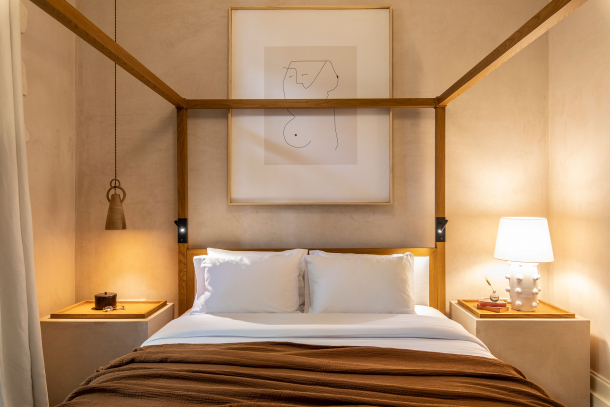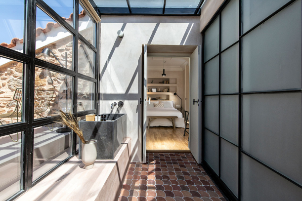 Pokoj v horním patře disponuje vestibulem plným slunce, který zároveň slouží také jako koupelna. K dispozici je zde i soukromá terasa, na níž si hosté mohou vychutnat mírné athénské klima v „boho-chic“ pohodlí.