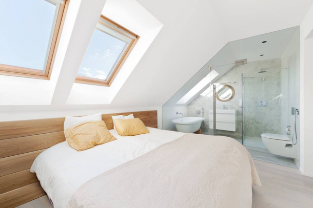 V bytě byla původně velká ložnice a koupelna, která se přeměnila na pokoj pro děti, pokoj pro hosty a menší koupelnu. Z dětského pokoje se stala velká ložnice pro majitele, kde nechybí druhá koupelna – designéři se opět rozhodi eliminovat zeď a nahradit ji sklem, které povýšily na další originální a odvážný prvek celého interiéru. Koupelnu vyzdvihli zajímavě řešenou stěrkou od BOCA, která místnosti dodala funkčnost a strukturu příjemně rezonující s měděnými prvky zrcadla, okenic i vanových podnoží. I zde se designéři museli potýkat s nemalým úkolem a přizpůsobit současné produkty stávajícím kanalizačním rozvodům. Kdyby se jim to nepodařilo, museli by zcela měnit již hotovou dispozici.