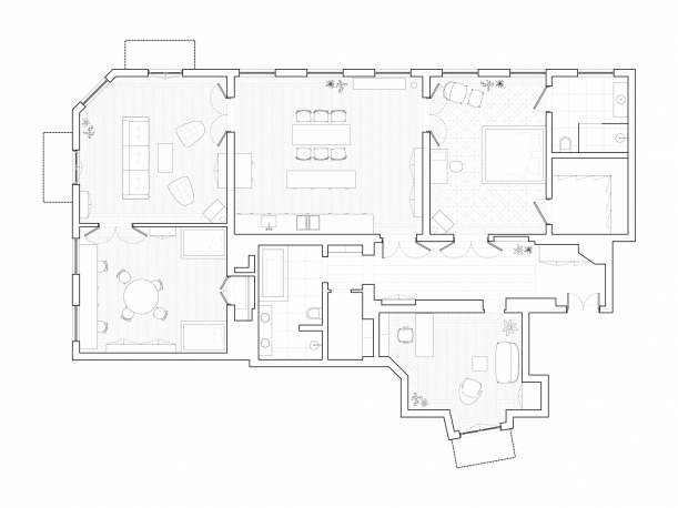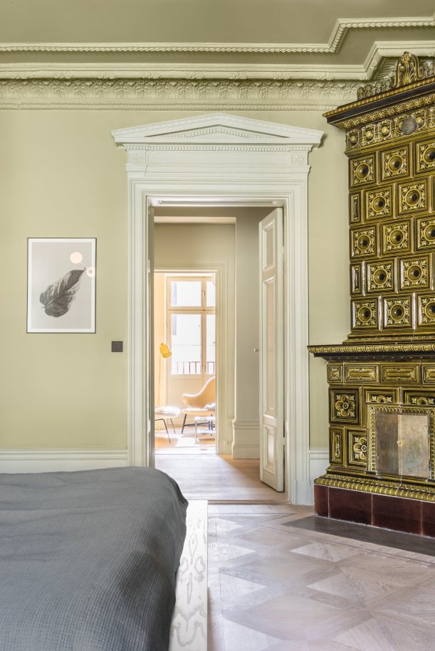 V obývacím prostoru se objevuje podobná paleta barev jako v kuchyni. Jsou zde tradiční stropní štuky, které kontrastují s moderním geometrickým osvětlením. Historickou vzpomínkou a zároveň stylovým kouskem v interiéru jsou původní zdobná kamna. Ty architekti ponechali nejen v obýváku, ale také v ložnicích.