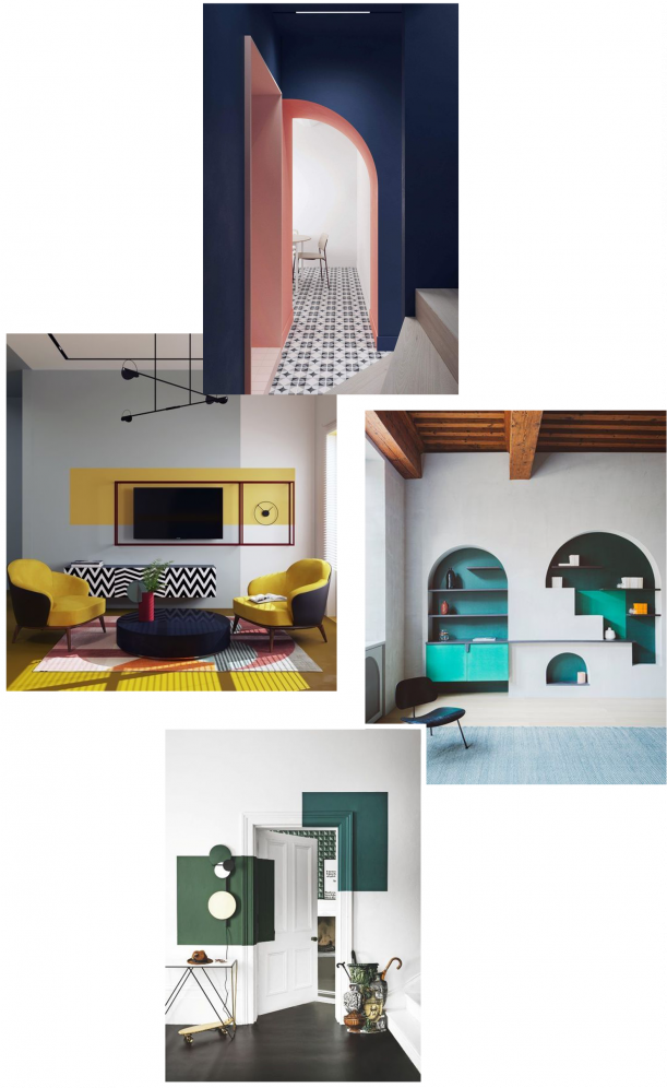 Výrazné barvy nabízí široké využití při modelování prostoru. Světlé odstíny vyniknou a opticky vystoupí, pokud mají v zádech tmavší barvu. Skvěle dotvarují objem vpadlých nik a záhybů nebo překvapí na neobvyklém místě – třeba jako grafické narušení pravidelné zárubně dveří. S pomocí barev se dají tlumit nebo zdůrazňovat nečekané detaily (trubky, topení, vypínače apod.), které na sebe v místnosti upoutají pozornost nebo záměrně splynou s podkladem. Opticky prostor zvětší, převrátí naruby či vytvoří milý moment překvapení – barvou lze na zdech doplnit monochromatický nábytek, znejistit pohled na kuchyňskou linku, případně jen pobavit. Humor totiž k tomuto stylu patří stejně neodmyslitelně jako jeho hravé vzory.