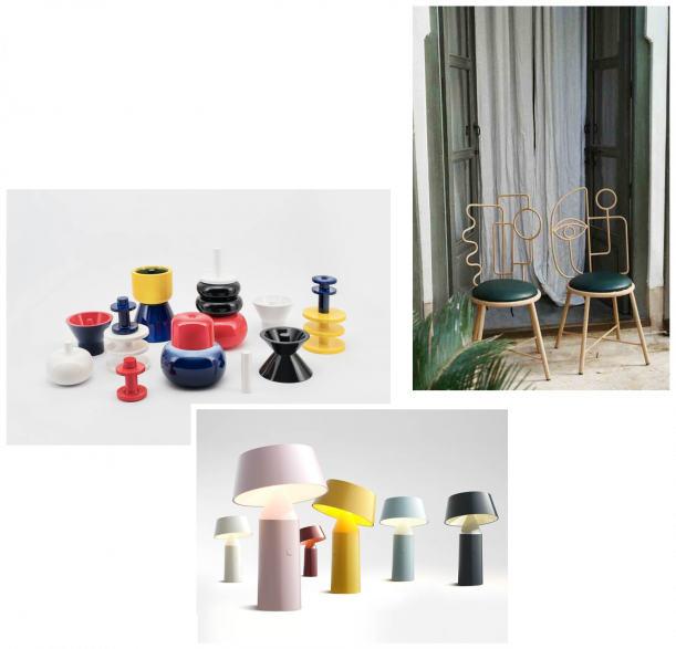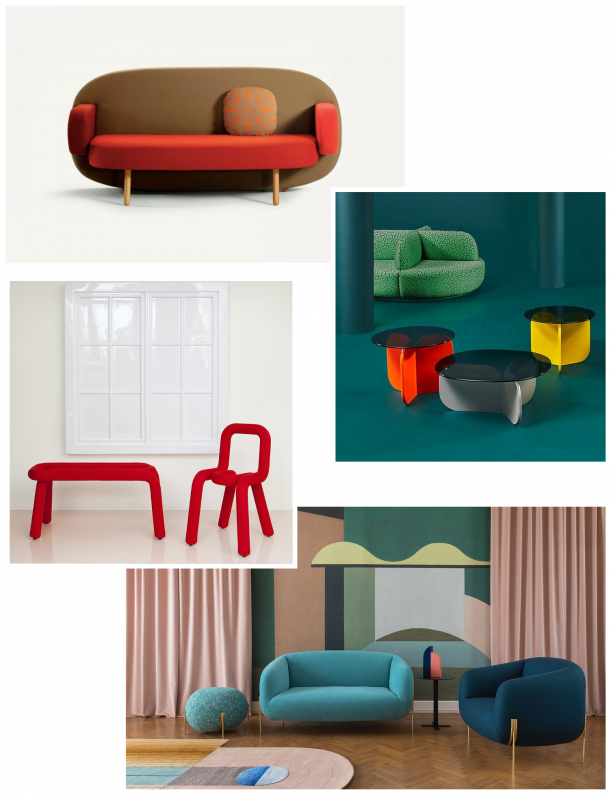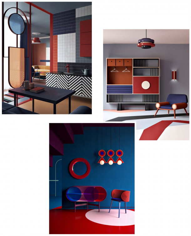Podobně jako Zinovatnaya můžete použít poměrně obyčejné předměty, jen ve výrazných barvách nebo neobvyklých propojeních, a doplnit je výraznými uměleckými kusy. Dobrou službu vám prokáže geometricky tvarovaný koberec od CC Tapis nebo dlaždičky od Peronda a Realonda. Podívejte se do nabídky španělské firmy Sancal, francouzských Moustache, dánských HAY, &tradition nebo italské Saba Italia. Krásná symbolická svítidla z keramiky nabízí zase polská designérka Pani Jurek, originální nábytek vymýšlí designéři Masquespacio pod značkou Mas Creations nebo Stine Aas pro Dims.