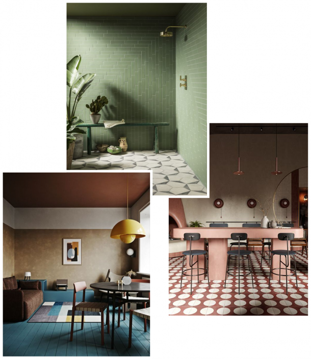 O něco jemnější vyznění městské geometrie nabízí paleta, která nebude tolik agresivní. Pokud je vám tento styl blízký, ale silné kontrasty vám nesedí, zkuste tónovat. Více odstínů jedné barvy vám umožní vytvořit harmonické místo, různé struktury předmětů pak zajistí, že se v něm nebudete nudit. Mechově zelené dlaždice výborně doplní zelená dřevěná lavice, velká pokojovka nebo keramická mísa, dál se dá prostor doplnit neutrálním tónem šedé s velkým grafickým vzorem, který mu dodá názor, a zlatými bateriemi pro luxusnější dojem.