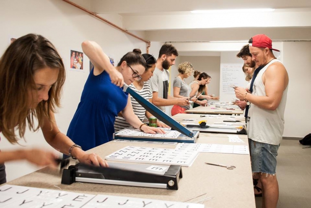 Členové z Remote year u “montážní linky”, na které vyráběli didaktické pomůcky pro neziskovou organizaci SIRIRI, o.p.s.