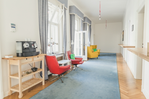 Uvnitř vily jsou stěžejním prvkem dvě schodiště, která spojují reprezentační prostory s obytnou částí. Hlavní dřevěné schodiště vede do prvního patra, zatímco vedlejší kamenné spojuje všechna patra. Dříve toto schodiště sloužilo pouze služebnictvu a umožňovalo vstup do kuchyně. V prvním podzemním podlaží najdeme i dnes saunu, dřívější technické a provozní zázemí bude brzy zrekonstruováno. Přízemí dominuje reprezentativní hala, která dříve sloužila jako obývací pokoj s jídelnou. Z ní pak ústí vstup na pískovcovou terasu s balustrádami a zahradu o rozloze 1 540 m². To vše doplňuje recepce, zasedací místnost a provozní kancelář - dříve vstupní hala se šatnou, knihovna a nezbytné provozní zázemí pro služebnictvo. Celkem osm ložnic v druhém a třetím nadzemním podlaží je dnes užíváno jako pracovní prostor pro členy coworkingu. Pracovním prostorem se stal také donedávna nevyužitý půdní prostor.