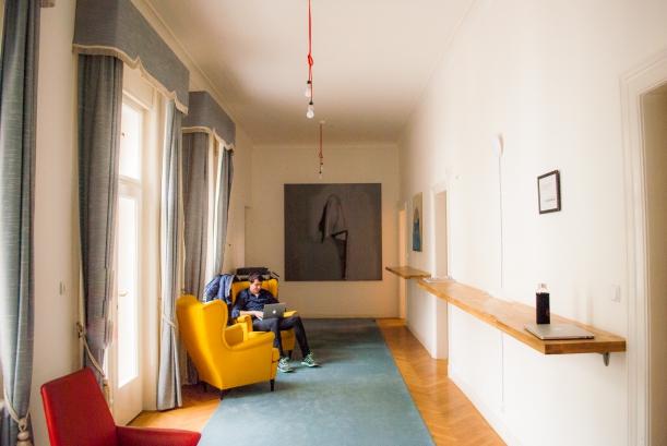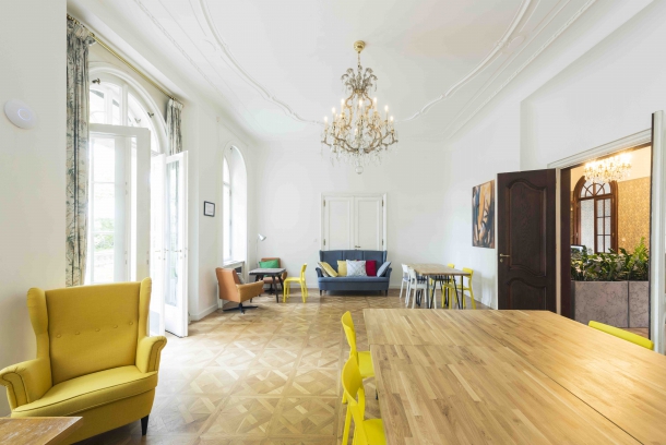 Společné prostory v rámci celé vily jsou výsledkem kombinace nových kousků a skvostů ulovených na bleším trhu. Některé stoly ve vile jsou z vlastní produkce a vyrobené na míru. Za designem opět stojí Kuba, který si na pomoc přizval šikovného truhláře. V horním patře pak společně nainstalovali police, které slouží jako stolky na stání, pokud už někoho unavuje sedavá práce.