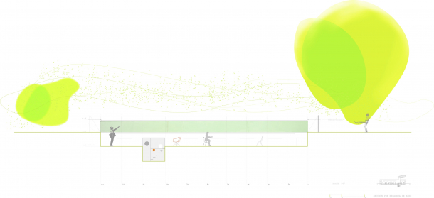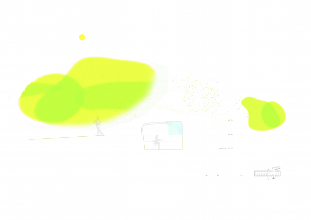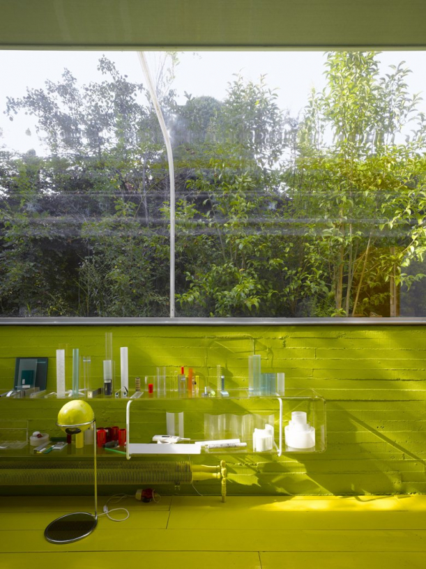 Podlouhlá stavba, připomínající tunel, je ze severní strany prosklená, takže se architekti mohou při práci kdykoli zahledět do okolní zeleně a odreagovat se. Část střechy je zároveň odkrytá, což umožňuje vstup nepřímého přirozeného světla do interiéru. Na jižní straně architekti navrhli neprůhlednou stěnu, aby se vyhnuli zahřívání a přímému slunci na svých pracovních stolech. Z boku je možné přirozené větrání, které se dá díky kladce regulovat.